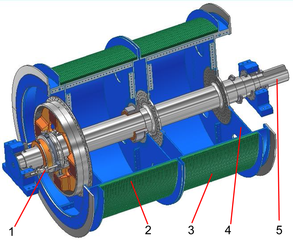 1.調(diào)繩離合器 2.游動(dòng)卷筒 3.固定卷筒 4.支輪 5.主軸