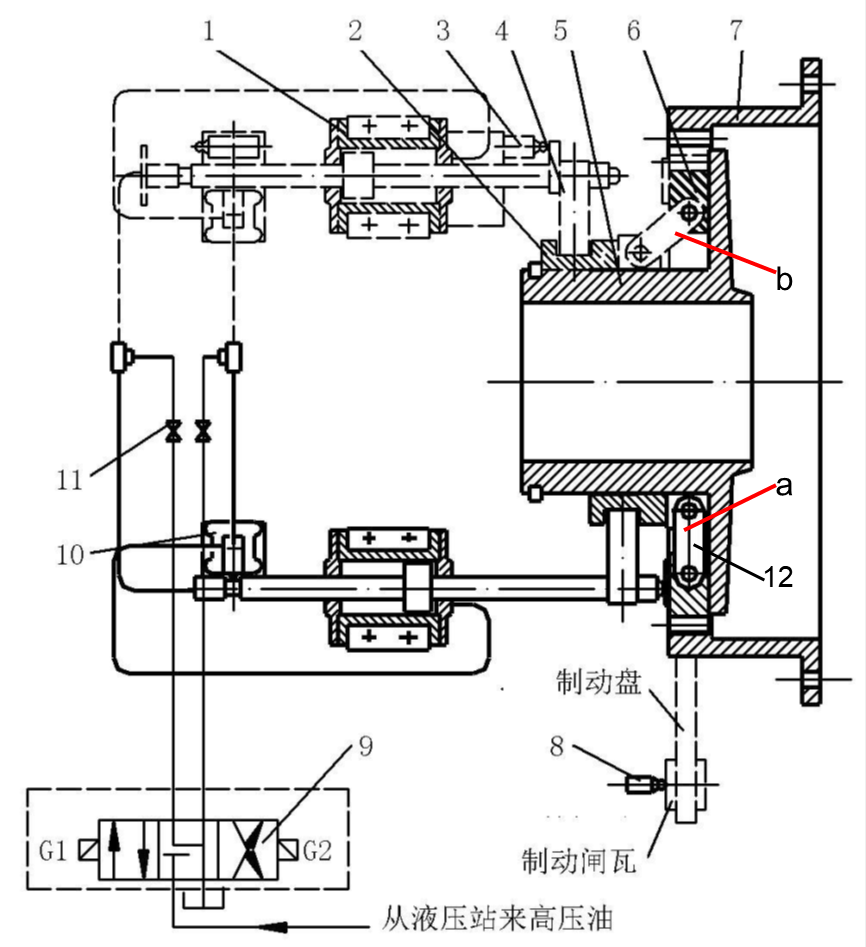 工作原理:(1)日常提升作業(yè)時(shí),固定在左端軸承座上的驅(qū)動(dòng)油缸推動(dòng)移動(dòng)輪轂沿主軸在固定輪轂滑動(dòng),從而帶動(dòng)連桿,并使齒塊沿固定輪轂的垂直方向滑槽滑動(dòng),使齒塊與內(nèi)齒圈嚙合,如圖中處于a的工作狀態(tài)。此時(shí),動(dòng)力從主軸傳遞至外齒圈,再到齒塊上,通過(guò)兩側(cè)滑槽傳遞到活動(dòng)滾筒上。主軸帶動(dòng)滾筒一起轉(zhuǎn)動(dòng),完成提升或下放任務(wù)。(2)調(diào)節(jié)繩長(zhǎng)時(shí),制動(dòng)器先鎖緊卷筒制動(dòng)盤,驅(qū)動(dòng)油缸拉動(dòng)移動(dòng)輪轂沿主軸在固定輪轂滑動(dòng),從而帶動(dòng)連桿,使齒塊與內(nèi)齒圈分離,如圖中處于b的工作狀態(tài)。即可進(jìn)行調(diào)繩操作。